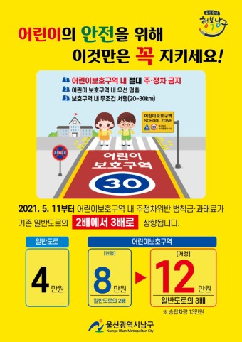 - 주정차 금지 구역 확대 및 위반 시 과태료 상향 : 스쿨존 내 주정차 금지 구역이 확대되며, 위반시 과태료가 기존 8만원에서 12만원으로 상향됩니다.
